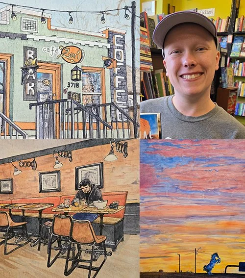 “I’m originally from Maine and New Hampshire, but I’ve grown to love Denver just as much as New England! From the architecture to the people, this is a home I love to capture in jaunty watercolor scenes. You can catch me painting outside of the local coffee shop, reading, gaming, or hanging with my cat, Professor Kitty.”