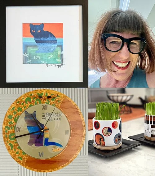 Jennifer “Jen” Bennett is an AuDHD Artist + Creative + Maker + Founder of The Autistic Cat. As a mixed-media and digital collage artist, Jen uses bold acrylics, graphic design, vivid sublimation, and integrated beadwork to create fun, quirky compositions that celebrate life, neurodiversity, and cats.