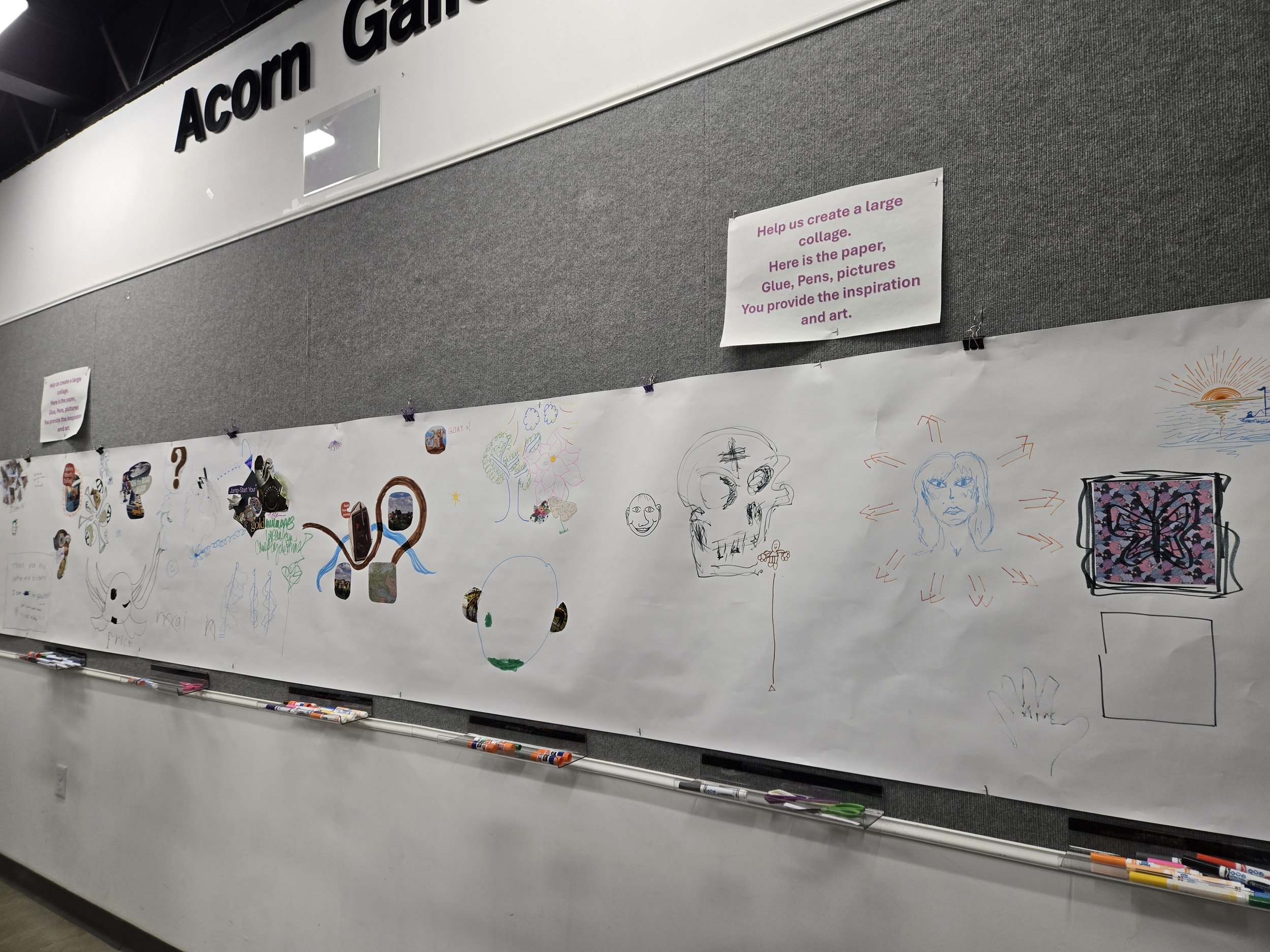 We have a wall dedicated to our community creating a collage together! There’s glue, magazine cutouts, and more, so come on down and help us create some art.