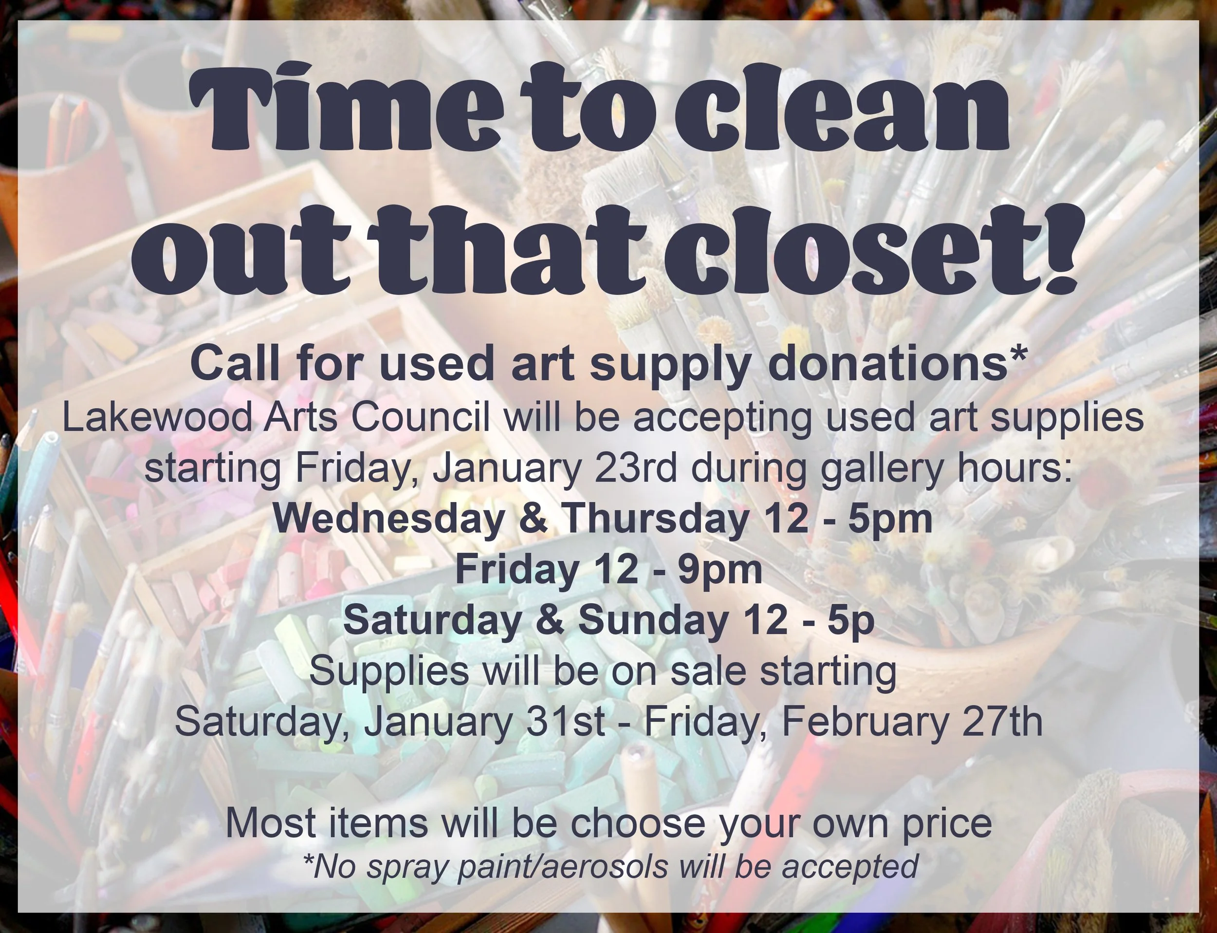 We’ll be accepting used art supplies throughout the month as well - if you have any art supplies that have been sitting around for a long time (that are still in good/usable condition), drop them off during our open hours! We do not accept spray paint or aerosols.